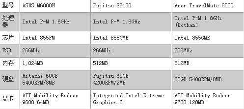 我想现在每个读者都在思考究竟这款Dothan核心的Pentium-M处理器比旧核心强多少呢?6千万晶体管用在了2MB的L2缓存上对处理器的性能提高是举足轻重的。下面我们就对新旧版本的Pentium-M处理器恩德性能进行对比测试。我们使用了ASUS M6000N和Fujitsu S6130作参考,他们都是使用Banias核心的笔记本,而今天的主角则是我们在前面提到的使用了Dothan核心的Pentium-M处理器的Acer TravelMate 8000。ASUS M6000N定位于桌面替代型笔记本电脑,强劲的性能表现是其设计的着眼点,在Mobility Radeon 9600显卡的辅助下可以游刃有余地应付日常的应用软件和大型游戏的需要。我们同时拿来Fujitsu S6130作参考是因为S6130是定位于行政人员的笔记本,通过其对比我们可以清楚的看到新的Dothan核心相对于旧的Banias核心在家用和商用性能的提高。