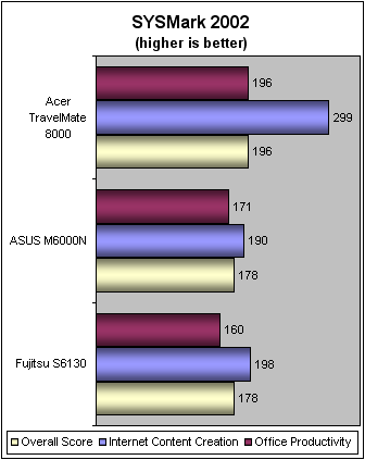 SYSMark 2002可以很好的测试出笔记本运行日常应用软件的性能表现。在Office Productivity性能测试时,Acer TravelMate 8000以196分高居榜首, 比ASUS和Fujitsu分别高了12?18%。Dothan核心中新增的 1MB L2缓存的作用开始发挥出来了,同时分数的领先也要归功于频率的领先。 在Internet Content Creation测试中频率和缓存的优势更加显著,Acer获得了299的高分,遥遥领先于对手达31?36%。这也是我们预料中的结果,因为这个测试对频率和缓存的依赖性较大。(从时钟频率上看新旧两款处理器的差距只有12.5%左右,但测试的结果则是两倍有多,那就可以看出 L2缓存的增加对处理器在Internet Content Creation测试中性能的提升了)。