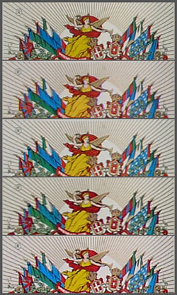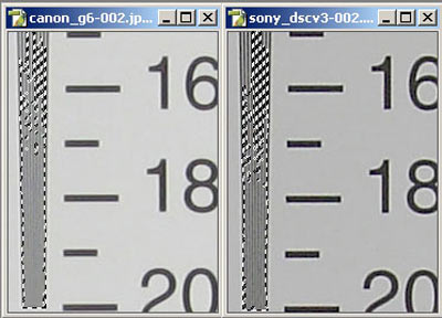 从左至右分别为卡西欧P700、宾得750Z、奥林巴斯C-7000、索尼V3和佳能G6的垂直解像力对比图,基本上我们可以直观用肉眼看出宾得750Z解像力最差,黑白线条混沌一片,卡西欧P700和奥林巴斯C-7000次之,佳能G6与索尼V3解像力最好。直观上索尼V3让我们感觉锐利些,通过Photoshop稍做处理就会发现V3的解像力的确比G6稍强。