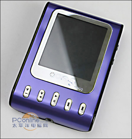 奥美嘉在国内数码厂商中算是比较有实力的一个,为了进一步扩大其MP3产品的影响力,推出吟唱风情系列 S500,黑色的显示屏幕占了2/3的面积,下方是五颗长形按键。边角位置着重的处理,黑色边线和紫色外壳的颜色搭配给予强烈的视觉冲击力。机侧还有四颗小小的圆形按键,机器顶部还有两个插孔,分别是3.5mm耳机输出和2.5mm的LINE-IN/USB接口,底部有个小小的RESET按键。整体体积只有72*50*13mm,体积比其他的彩屏还比较有优势的。