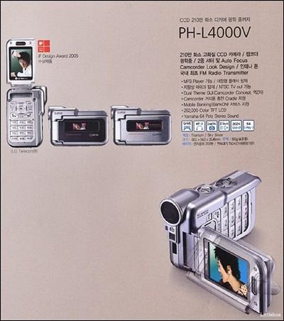 该款手机从外型上完全采用了可携式数码摄像机的设计。不仔细看的话,根本无法辨认出这是一款手机。PH-L4000v采用了折叠式设计,屏幕打开后还可以进行360度旋转,很方便拍摄。该手机的镜头和一般的数码摄像机的镜头很像,采用了210万像素的CCD镜头,支持2倍光学变焦及自动数码对焦。在拍摄功能上采用NTSC制式,并支持TV-OUT功能,可直接在电视上显示拍摄内容。
