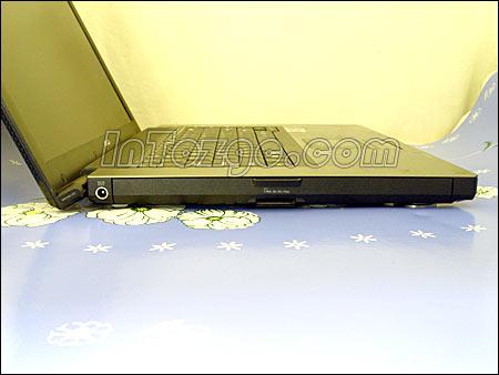 在机身的左侧,除了一个电源插口以外,其余接口都被一个挡板隐藏起来了。打开挡板,我们可以看到,大部分常用外接端口都被集中在里面了,从左到右分别是:VGA OUT、LAN、MODEM、S端子、PC卡插槽和SD/MMC/MSpro三合一读卡器,TV天线接口、1394口与2个USB2.0。