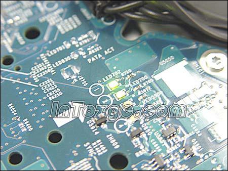 带着疑问,以极大的信心和勇气,在开盖情况下接上了电源,发现主板上一个绿色的LED灯亮了,这表示电脑已经通电。