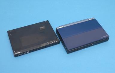 如果只看笔记本本身的话,Libretto U100是一款单轴的笔记本,但是如果安装了DVD底座的话,U100就摇身一变成为了两轴笔记本。DVD底座是经过USB接口进行工作的,可以进行热插拔。