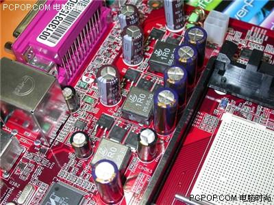 微星K8N SLI-F主板采用三相供电设计的,单相采用三颗MOSFET芯片,并沿用了微星独有的Active MOS安装方式??MOS芯片金属面向上,与散热器直接接触,加强散热效果。CPU插槽附近的电容均为高品质日系制品,规格和用料毫不吝啬,看得出微星为了保证主板稳定高效工作,着实费了一番心思。