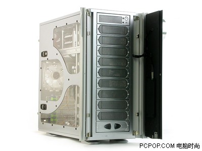 Kandalf除了令人震撼的外观和散热能力外,内部结构更是让人惊喜。在机箱前面板上共10个5.25”安装位,内置8个3.5”安装位,极为轻松的就可支持服务器系统使用,DIY用户的感受自然超凡脱俗。在机箱面板的最下方,是一个抽屉式5.25”的零件盒,方便DIY用户一些日常工具的存放,后置抽取式硬盘装置槽让硬盘的安装更加方便,散热更加有效。同时Kandalf系列机箱还可以通过BTX升级套件,能同时兼容ATX和BTX的架构,为日后升级做足准备。