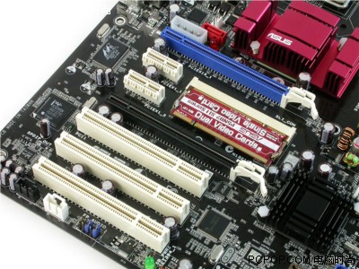 主板上各个元件都放得很好,如显卡和显卡之间就隔得很好,这样做可以利于空气的流通和散热。同时,华硕还将2个PCI Express x1插槽放在了2个PCI Express x16插槽之间。