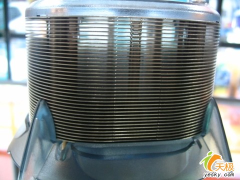另外在中间热管从铜底向上流经40层柱面的鳍片,均匀而整齐并通过中央的离心风扇产生的高负压吸风区域将冷风快速吸入并对散热鳍片进行冷却。这种散热方式是通过离心风扇吸取散热器的顶部和底部的冷风,并对360度周围的鳍片进行散热。采用这种散热方式可以获得最大的散热面积。