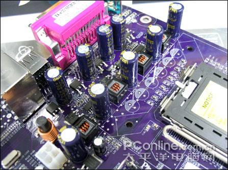 CPU供电部分使用了大量的高品质电容,清一色3300uF大容量OST电容。而标准的四相供电设计不仅仅让人看着赏心悦目,更多的是使用户有一份安心使用的感觉。