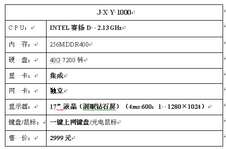 这款商务精英JXY1000电脑性价比很高,INTEL 赛扬D 2.13GHz处理器+独立网卡+17寸液晶,只要2999元,成为市场上商务电脑的低价之选。目前,金翔云电脑的液晶风暴促销活动正在进行中,全部采用润眼钻石液晶屏,响应时间4ms, 600:1的对比度,1280×1024的分辨率,可视度160℃。 此款机器只限在金翔云销售中心订购!