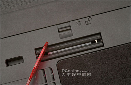 S6311的背部显得异常平整,设计也显得非常严谨,一丝不苟,但是背部很少进风口,只在靠近前端的地方有一个。四个边角的橡皮垫也起到了防滑作用,另外在内存位置覆盖了一层皮质的材料,具有非常舒服的手感,这种设计只有在富士通的笔记本电脑上看到,主要起到隔热的作用。S6311的进风口基本上是设计在机身两侧和前端,并且是侧面偏下的位置,这样避免了将进风口设计在底部带来诸多隐患和散热不理想。整机大量采用金属材质,因此为良好的机身温度控制打下来坚实的基础。硬盘被放置在一个带有许多孔状的金属盒子里面,不光能起到很好的屏蔽作用,而且能及时将硬盘的热量散发出去。