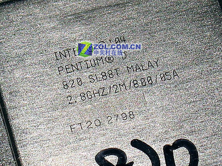 产品顶盖上标注了“Pentium D 820”字样,实际主频为2.8GHZ,L2级缓存为2MB,前端总线为800MHZ,编码为SL88T,产地为马来西。由于产品采用分立式硅晶体设计,因此每个CPU核心都独立拥有12KμOps、16KB D-Cache和1MB L2 Cache,但仍为NetBurst架构设计,对外采取共享一组800MHz前端总线设计。硅晶面积为206mm2,采用和Pentium XE一样的90nm制程及Smithfield核心。