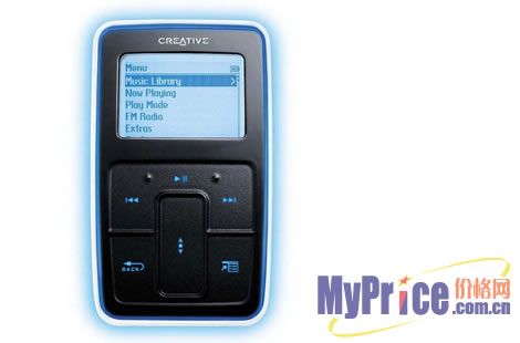 ZEN Micro的按键位于屏幕下方,按键分别负责播放/暂停、上一曲、下一曲、返回、详细信息和音量控制。按键区域面积较大,触感舒适,单手即可操作。在使用时,按键标志可发出幽蓝色光。