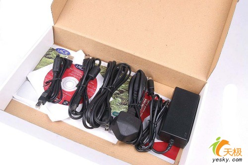 此款产品的附近也是相当的丰富,提供一根USB2.0数据线,一根IEEE1394数据线,一个电源适配器。为了方便不同的用户使用,专门为这个电脑适配器准备了三角与两角两根不同的电源线。另外,还随机赠送NERO安装盘。由于提供的附近较多,因此包装中提供一个独立的盒子来装这些附近。