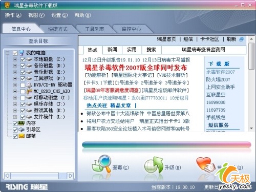 在通过注册后,我们就可以正常使用瑞星2007杀毒软件的全部功能了。进入瑞星2007的主界面后,我们看到新的版本界面采用了更为舒适的色调。功能按钮以及工具栏依然中规中矩。