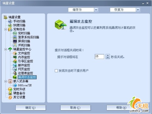 监控中心中所包含的功能有很多,其中漏洞攻击监控可以阻截利用系统漏洞对计算机的攻击,减小了计算机的遭受破坏的威胁。另外网页监控可以拦截网页恶意脚本或病毒,阻止病毒通过网页进行传播。