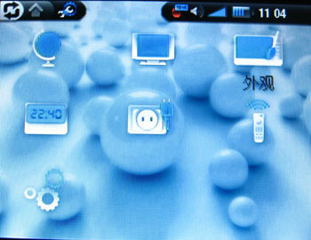 炫爱404主菜单采用9宫格设计,菜单背景图与菜单图标的显示颜色都采用了可调节设计,用户甚至可以抓取视频画面作为菜单背景图。显示菜单顶部为状态菜单,左侧为菜单切换栏,右侧为系统状态栏,包含耳机连接显示、音量显示、电池剩余显示、时钟显示。右侧为菜单栏,通过按动菜单按键可以呼出菜单进行调节。