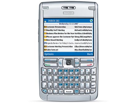 E62的强大商务功能还不仅仅就是这些,还包含了对常见的IMAP4和POP3协议的支持,收发邮件畅通无比。E62在五维摇杆的右侧设置了一枚专用的电邮键,附带了强大的Mail for Exchange软件,通过网络服务器的支持可同步日历、电邮、联系人等个人信息。通讯录可在同一联系人列表中添加多个该联系人的各种信息。网络浏览器支持进阶的cmnet、wifi等接入方式连接互联网,MobileBrowser 3.0浏览器还支持多种缩放,并能设置禁止弹出窗口。