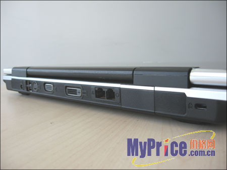 机身的后面接口更加丰富,其中包括电源插孔,2个USB2.0,S-Vidio接口,VGA,DVI,RJ-11和RJ-45,这里集中了本本大部分接口,不过距离适中,使用起来并不麻烦。
