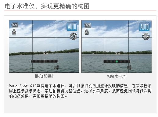 PowerShot G12配备了双重IS影像稳定器,除了现有的震动陀螺仪以外,还采用了加速计,使IS组件的驱动更加准确。不但支持现有相机抖动校正(相机角度抖动)外,还支持另一种抖动校正,即微距拍摄模式的平移抖动(越放大拍摄,抖动越明显)。通过准确校正相机平移抖动,不仅可以在拍摄领域实现较好的影像稳定效果,在微距拍摄领域同样可以实现。