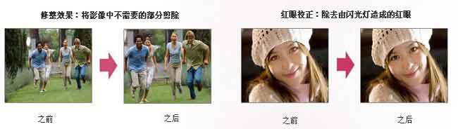 使用便捷的修饰功能可以在相机内修改由DSC-J10拍摄的图像。可通过两种编辑功能增强图像效果和生成特效:修整效果、红眼校正。DSC-J10内置照片加工功能,可以对所拍摄的图像进行加工和编辑。修整效果可将图像中不需要的部分剪除,红眼校正效果可缓解闪光灯造成的红眼。