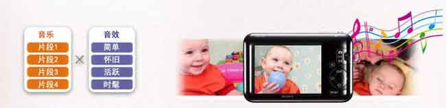"音乐串片秀"功能可实现照片MTV般的播放效果。您可以将拍好的照片,配合自己喜欢的音乐在相机中回放,实现动感的观赏效果。四种可视化效果(简单、怀旧、活跃、时髦)与相机中存储的四首自带音乐片段自由搭配,实现趣味十足的幻灯片放映,您可选择将存储的照片和动态影像全部播放,也可根据人脸类型和拍摄日期进行个性化音乐串片秀的欣赏。