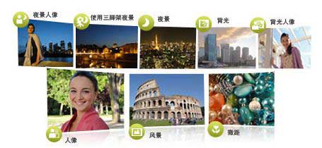场景选择: 高感光度/柔和快照/风景/夜景人像/夜景/手持夜景/背光校正HDR/动作防抖/美食/宠物/海滩/雪景/烟火/美肤
