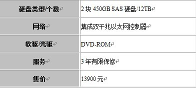 内存方面,配备4GB ECC DDR3,通过内置的18个内存插槽可以实现最高192GB内存扩展。存储方面,支持SATA/SAS硬盘接口,提供2块450GB SAS硬盘,并配备有DVD和双千兆网卡。此外,在散热系统方面,用户可以选购冗余冷却系统。