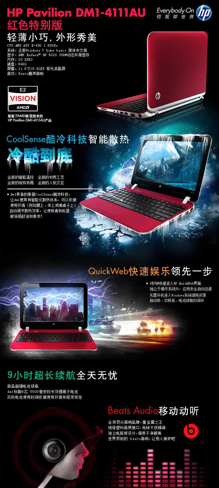 HP Pavilion dm1机型是全新一代11.6超小机型,具有上网本不可具备的全性能,更有普通大笔记本不可比拟的移动性。Dm1采用全新AMD APU平台,具有强大的3D图形处理能力,让高清娱乐和游戏娱乐处处得心应手。而dm1具备的惠普CoolSense酷凉科技,让的dm1更具有智能化散热体系,可以依据使用环境(例如腿上、床上或者桌子上)自动调节散热效率,让使用者和机器都倍感舒适和清凉!