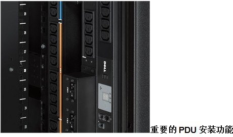 配电:集成式托架可为立式配电装置(PDU)提供免工具安装。