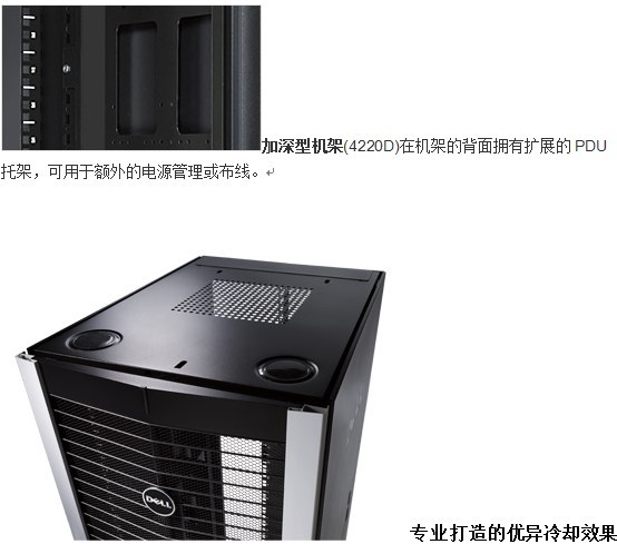 4220机架的设计可使空气更通畅地流动。 前门和后门有80 %的穿孔,再加上灵活的气坝,有助于阻止热空气从后向前流动,从而缓解了许多机架中常见的问题。 戴尔的加宽型机架式盘柜采用了横跨于前端的加大型气坝,以确保适当地限制空气流动。 附带的空白面板可针对机架中未使用的U空间,进一步控制空气流动。 为了实现热通道/冷通道高效散热的数据中心拓扑,标准型机架式盘柜占地面积为两块标准地砖,宽2英尺,深4英尺。 4220W机架稍宽,而4220D机架稍深。 空间规划员可以选择最适合其数据中心需求的外形。面向高效企业的基础架构为了提高数据中心效率,戴尔提供一系列附件来帮助您进一步提高电源管理、增强空气流动并简化组件安装。 其他选项包括机架式风扇、设备架和1U KMM(键盘/显示器/鼠标)控制台。