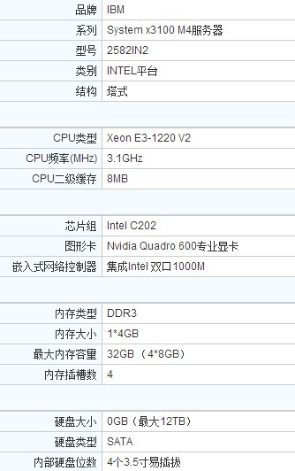 IBM X3100 M4塔式服务器 2582iN2(E3-1220 4G 无硬盘/标配4个硬盘位 Q600 DVD 键鼠 支持软RAID 0,1,10) 7499元